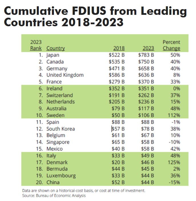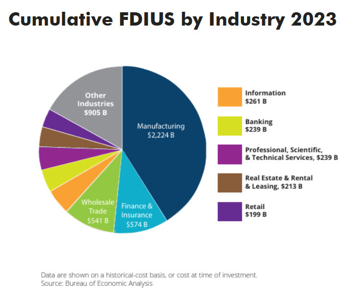 In 2024, the U.S. received $353 billion in Foreign Direct Investment (FDI), a 22% increase over 2023, and marking the 12th straight year it has led the world in FDI inflows. The U.S. also leads in cumulative inflows (the total value of all foreign direct investments held by foreign investors in a country at a specific point in time), sitting at about $5.4 trillion.